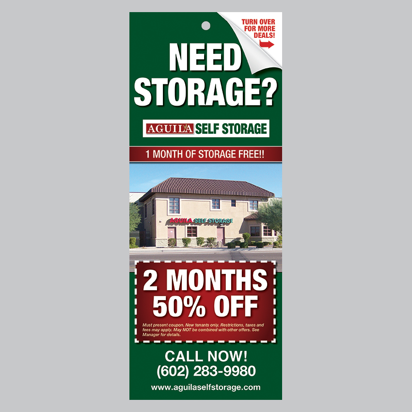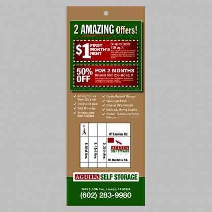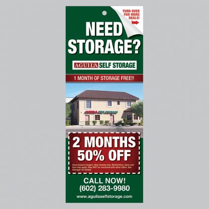 Doorhangers are 4.25″w x 11″h printed 14pt cardstock. They feature a 1/4″ hole which you can loop a rubber band through, making it easy to hang on a doorknob or lever. Allow two weeks for delivery. Pricing does not include shipping or any applicable tax.
