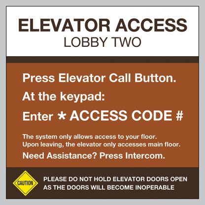 Elevator Access Lobby Two sign is 8″w x 8″h, directly printed on aluminum sandwich board. Allow one week for delivery. Pricing does not include shipping or any applicable tax.