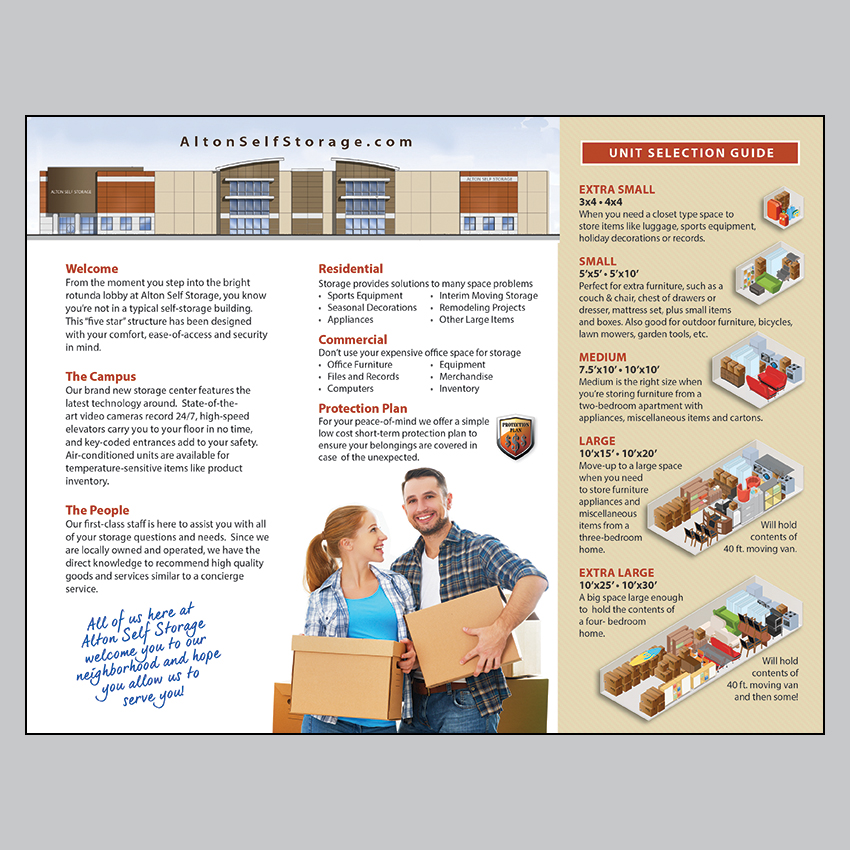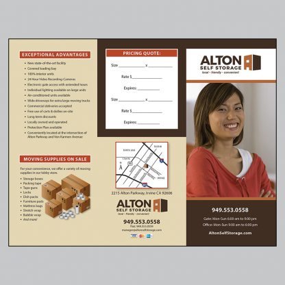 Brochures are 3.5″w x 8.5″h, folded (11″x8.5″ flat), on 100lb dull book stock with satin AQ coating. Available in quantities of 500, and 1000. Allow two weeks for delivery. Pricing does not include shipping or any applicable tax.