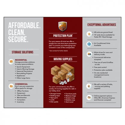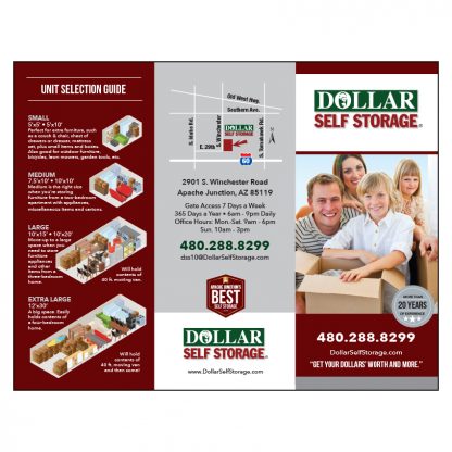 Brochures are 3.5″w x 8.5″h, folded (11″x8.5″ flat), on 100lb dull book stock with satin AQ coating.  Available in quantities of 500, and 1000.  Allow two weeks for delivery. Pricing does not include shipping or any applicable tax.