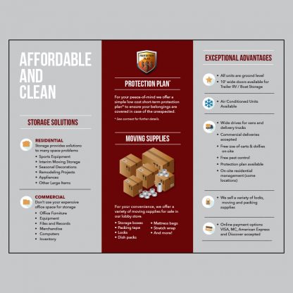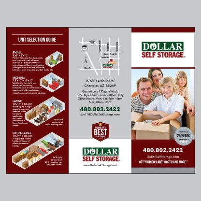 Brochures are 3.5″w x 8.5″h, folded (11″x8.5″ flat), on 100lb dull book stock with satin AQ coating. Available in quantities of 500, and 1000. Allow two weeks for delivery. Pricing does not include shipping or any applicable tax.