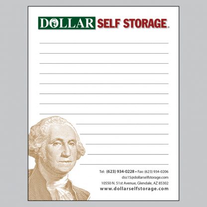 Notepads are  4.25″w x 5.5″h. Each pad has 25 sheets printed one-side on 70lb. premium uncoated stock with chipboard backer. Available in a quanity of 100.  Allow two weeks for delivery. Pricing does not include shipping or any applicable tax.