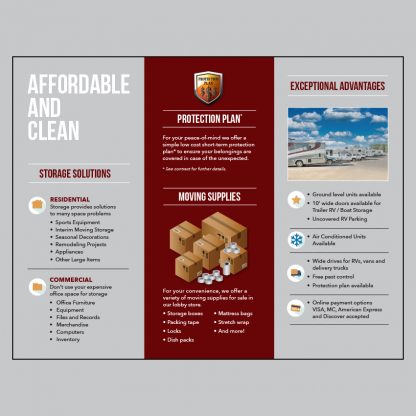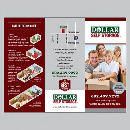 Brochures are 3.5″w x 8.5″h, folded (11″x8.5″ flat), on 100lb dull book stock with satin AQ coating.  Available in quantities of 500, and 1000.  Allow two weeks for delivery. Pricing does not include shipping or any applicable tax.