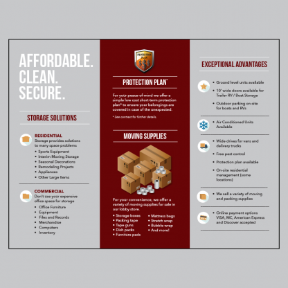 Brochures are 3.5″w x 8.5″h, folded (11″x8.5″ flat), on 100lb dull book stock with satin AQ coating. Available in quantities of 500, and 1000. Allow two weeks for delivery. Pricing does not include shipping or any applicable tax.