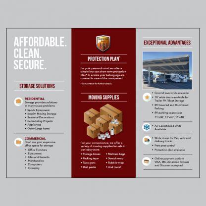 Brochures are 3.5″w x 8.5″h, folded (11″x8.5″ flat), on 100lb dull book stock with satin AQ coating. Available in quantities of 500, and 1000. Allow two weeks for delivery. Pricing does not include shipping or any applicable tax.