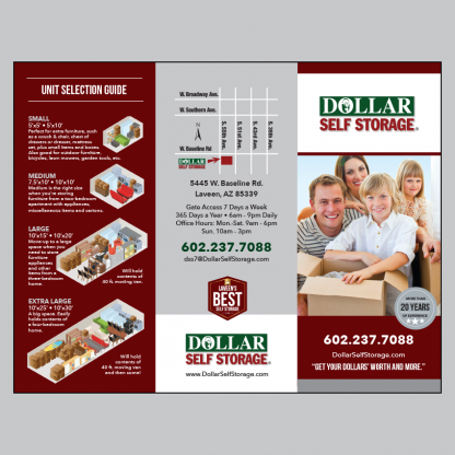 Brochures are 3.5″w x 8.5″h, folded (11″x8.5″ flat), on 100lb dull book stock with satin AQ coating. Available in quantities of 500, and 1000. Allow two weeks for delivery. Pricing does not include shipping or any applicable tax.