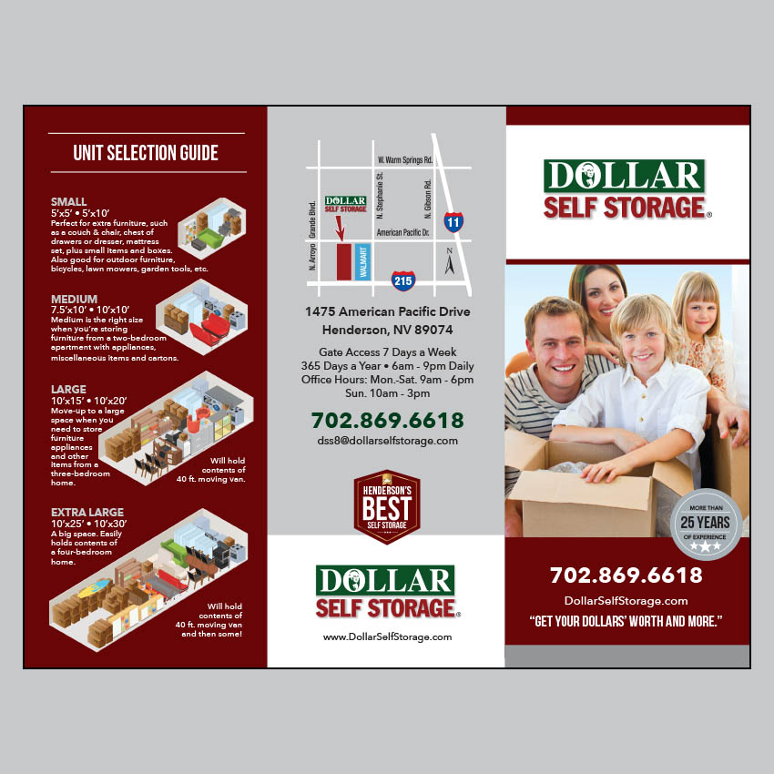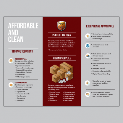 Brochures are 3.5″w x 8.5″h, folded (11″x8.5″ flat), on 100lb dull book stock with satin AQ coating. Available in quantities of 500, and 1000. Allow two weeks for delivery. Pricing does not include shipping or any applicable tax.