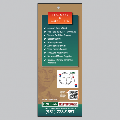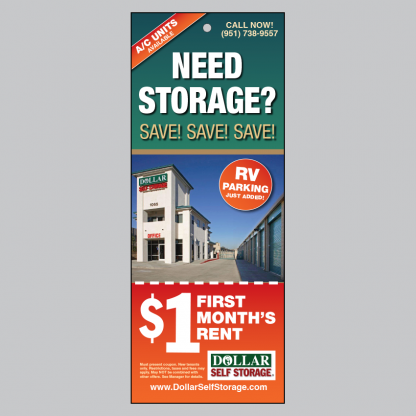 Doorhangers are 4.25″w x 11″h printed 14pt cardstock, with UV (high gloss) coating both sides. They feature a 1/4″ hole which you can loop a rubber band through, making it easy to hang on a doorknob or lever. Allow two weeks for delivery. Pricing does not include shipping or any applicable tax.