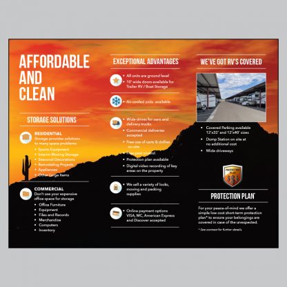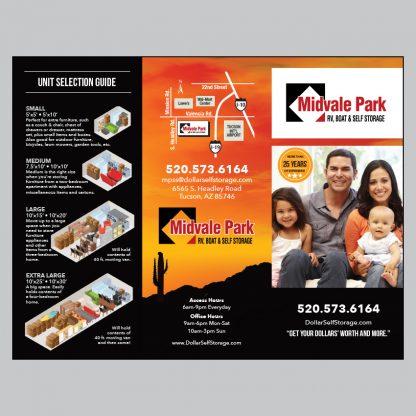 Brochures are 3.5″w x 8.5″h, folded (11″x8.5″ flat), on 100lb dull book stock with satin AQ coating. Available in quantities of 500, and 1000. Allow two weeks for delivery. Pricing does not include shipping or any applicable tax.