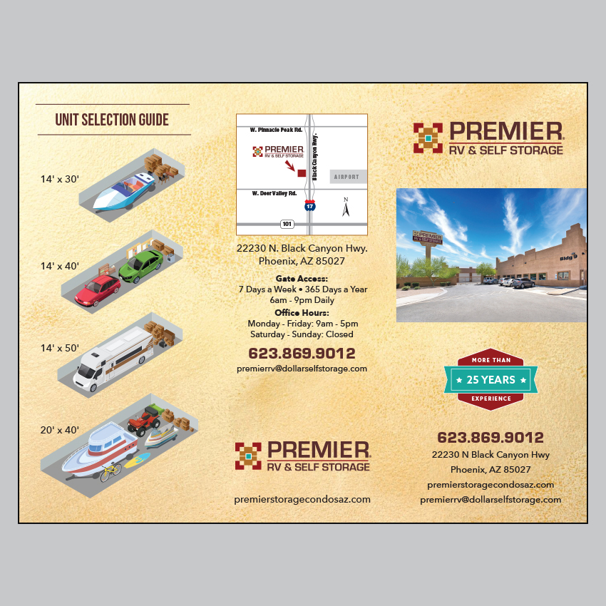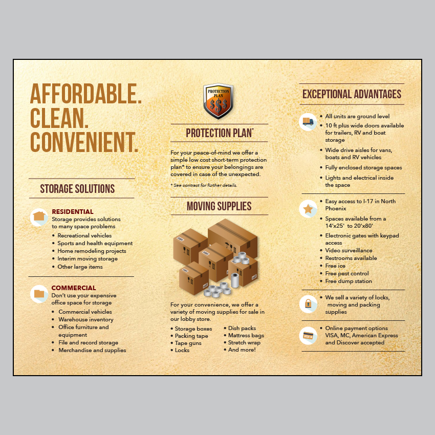 Brochures are 3.5″w x 8.5″h, folded (11″x8.5″ flat), on 100lb stock with matte finish. Available in quantities of 500, and 1000. Allow two weeks for delivery. Pricing does not include shipping or any applicable tax.